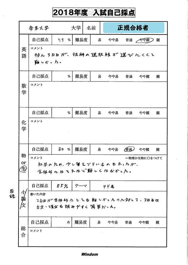 ウインダム生の合格者コメント・自己採点